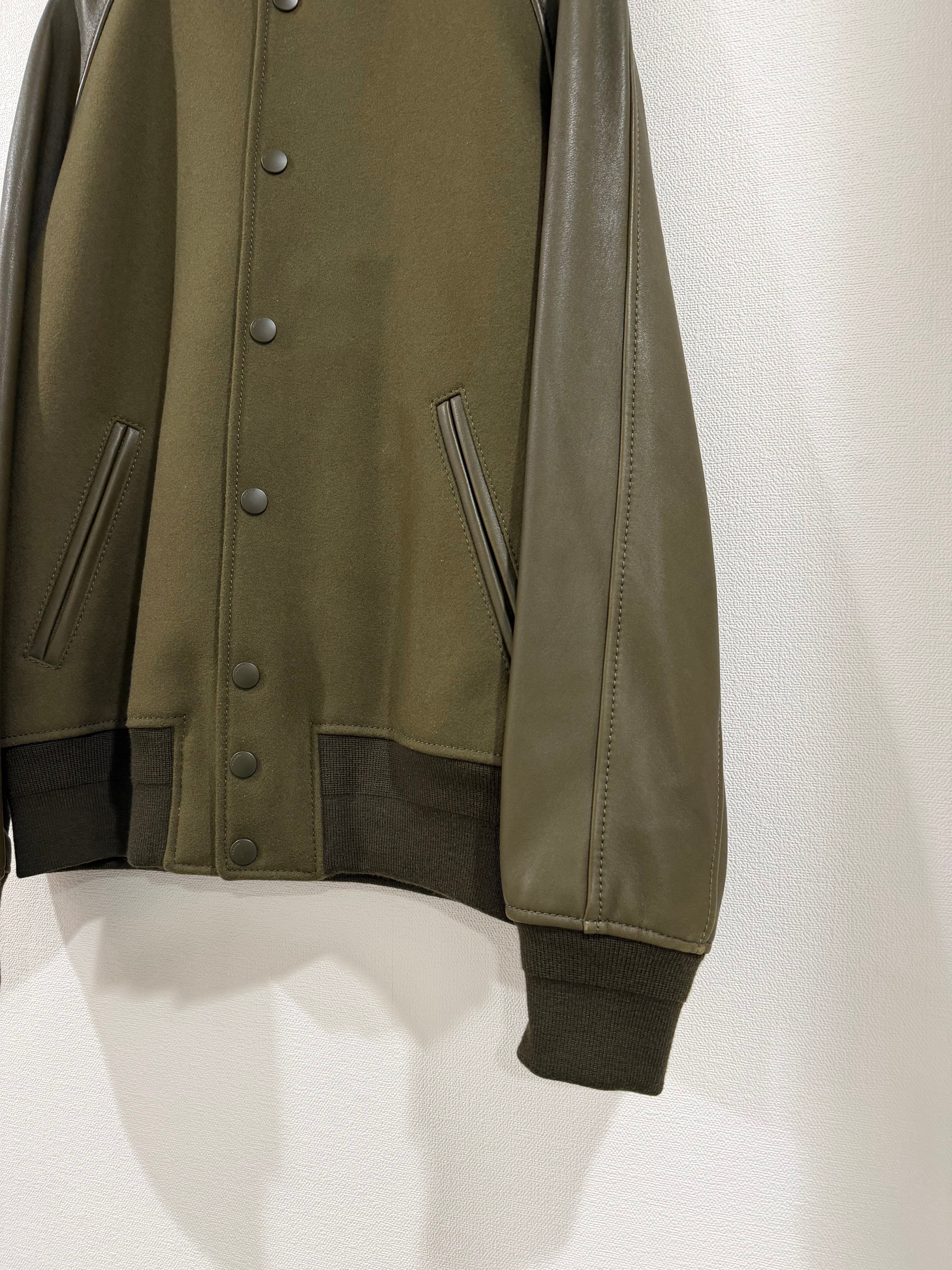 落ち着いたオリーブカラーでまとめられており、カジュアルなスタジャンながらも非常に大人っぽい印象。リブやスナップボタンも同系色で統一され、ミニマルで洗練されたデザインに仕上がっています。