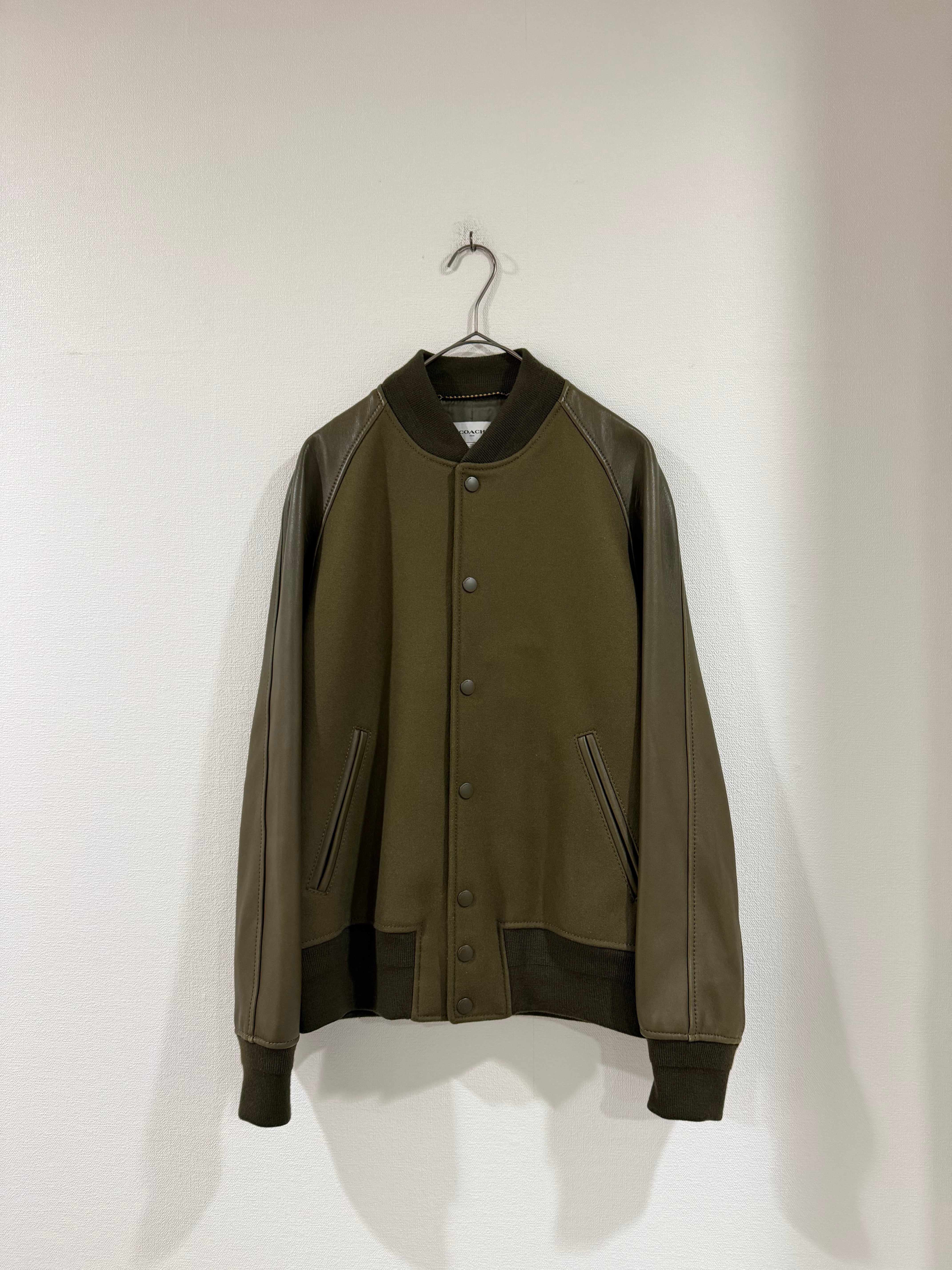 COACHらしい上質な素材使いが際立つ、レザー切替仕様のスタジアムジャケット。身頃には上質なウール素材、袖にはしなやかなラムレザーを使用した、高級感のある一着です。