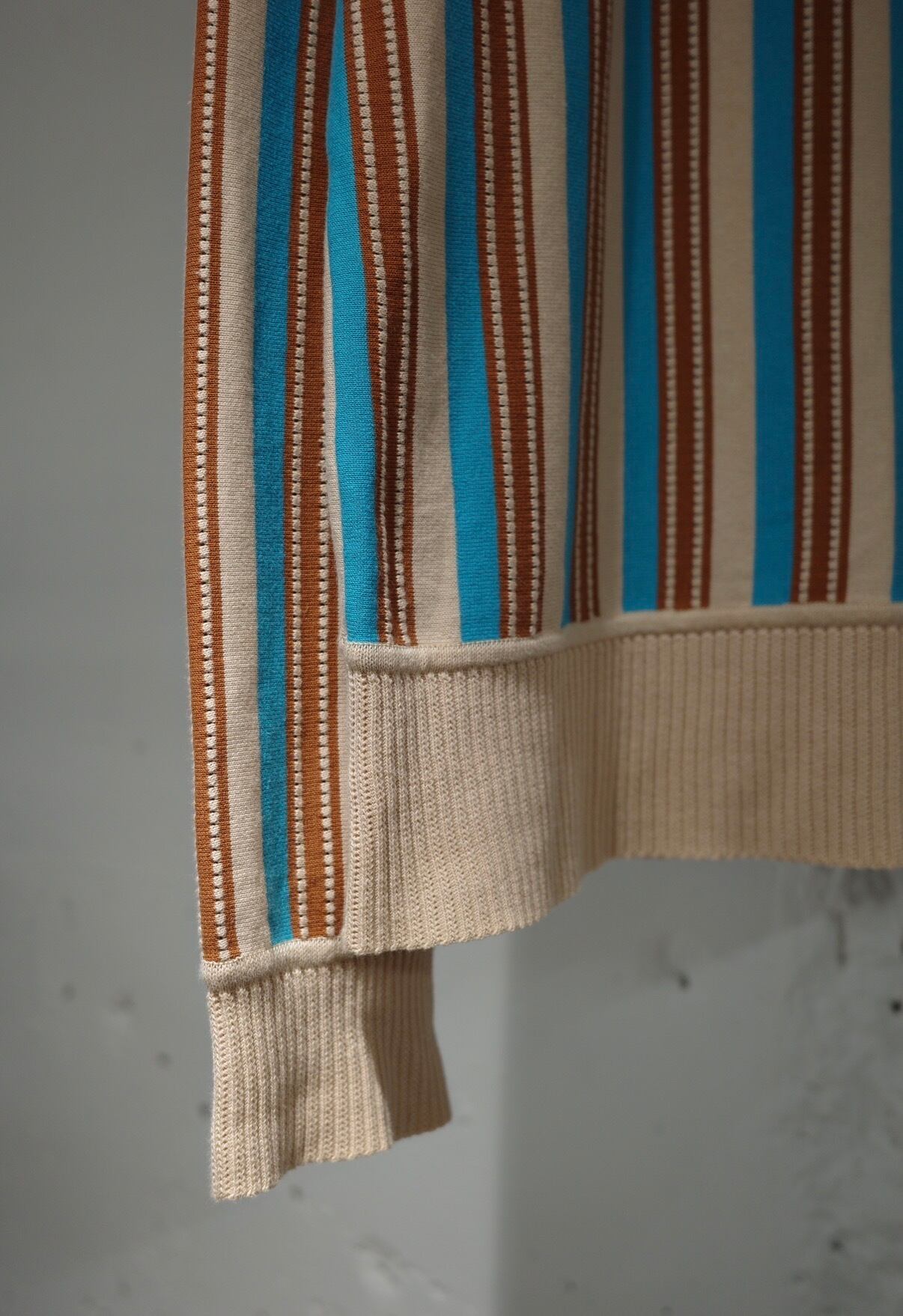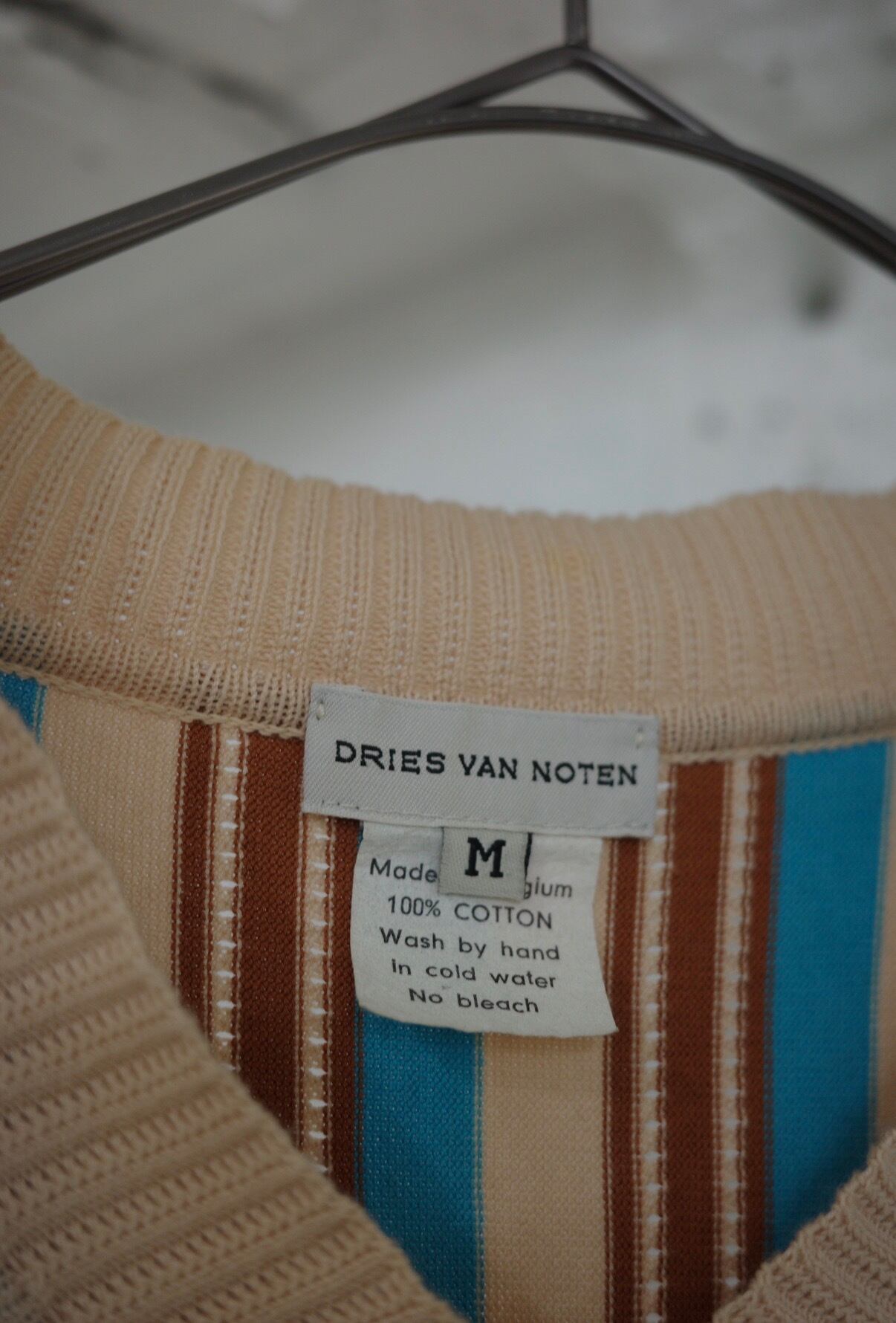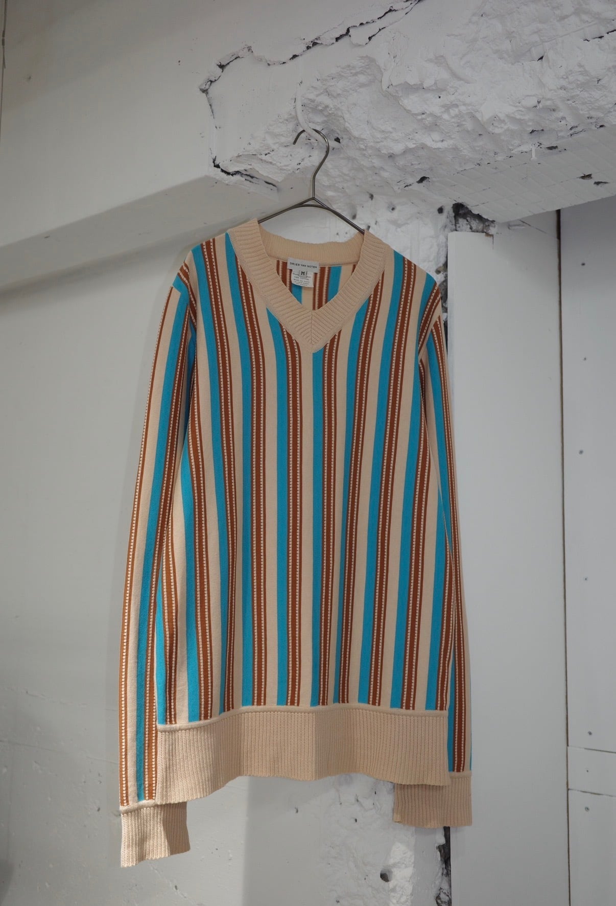 まず目を引くのは、このストライプ。ベージュをベースに、ターコイズとブラウンがリズミカルに走る配色は、一見クラシックでありながら、どこか異国的なニュアンスを帯びている。派手ではないのに確実に印象に残る、この“色のレイヤー”こそドリスの真骨頂。