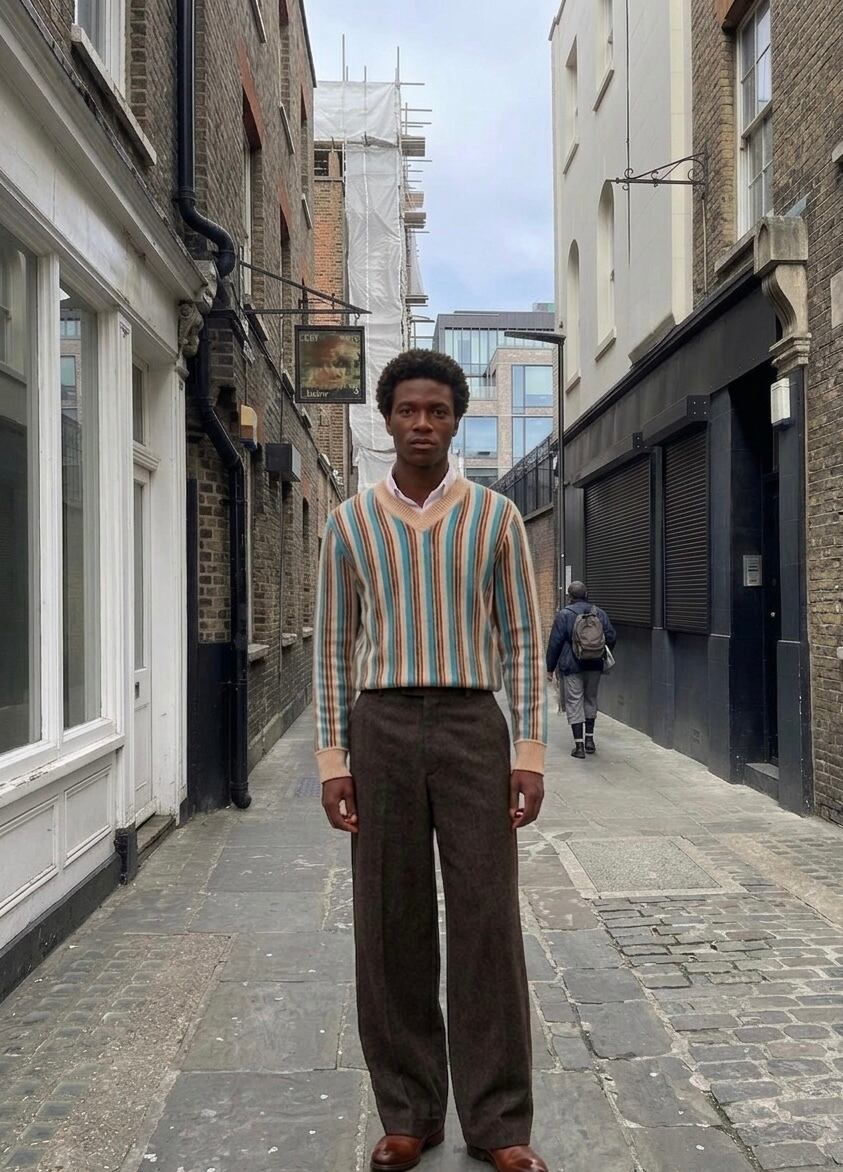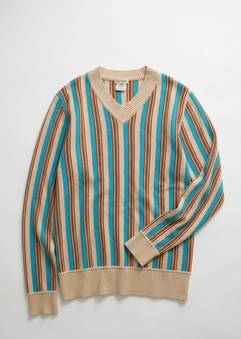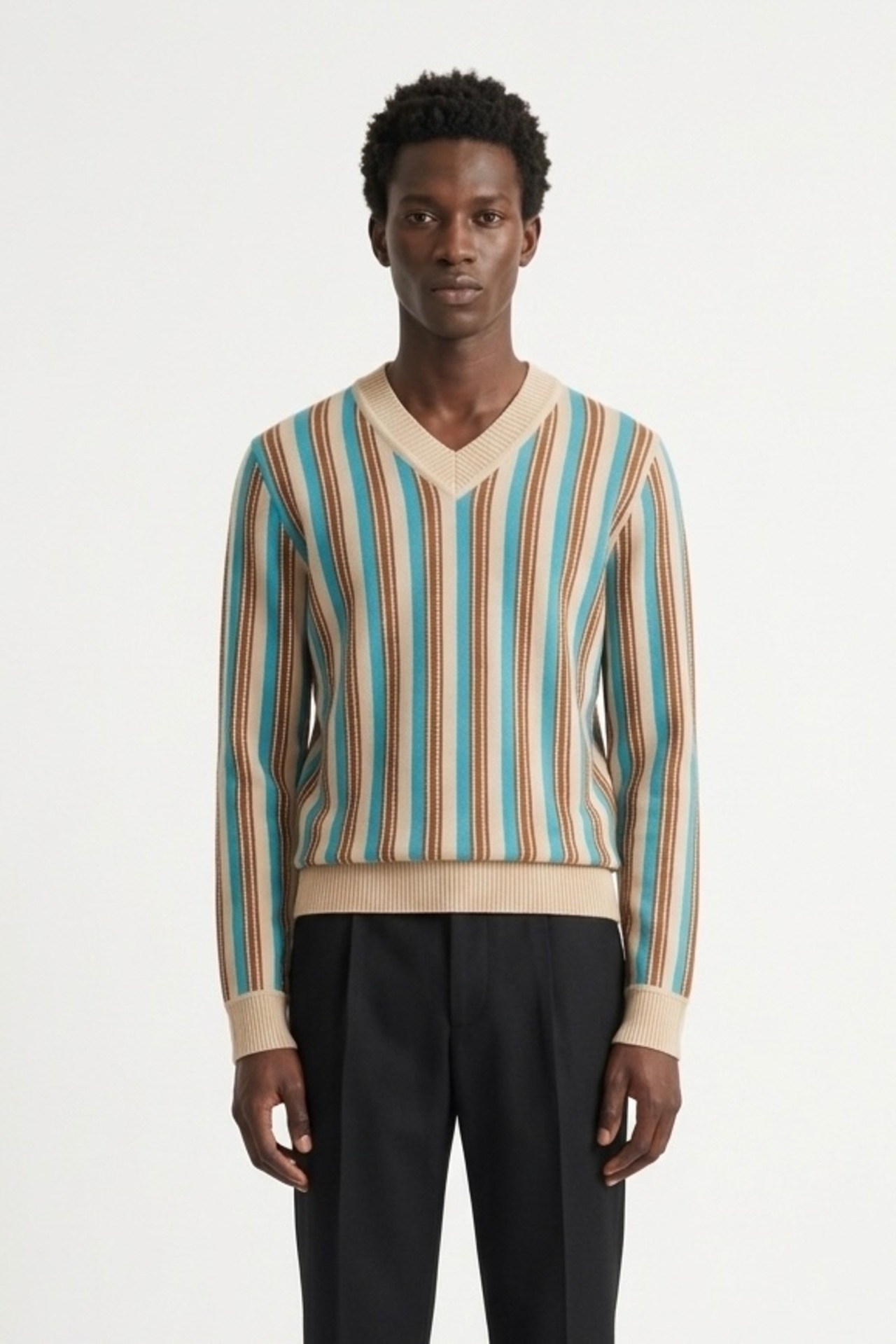 まず目を引くのは、このストライプ。ベージュをベースに、ターコイズとブラウンがリズミカルに走る配色は、一見クラシックでありながら、どこか異国的なニュアンスを帯びている。派手ではないのに確実に印象に残る、この“色のレイヤー”こそドリスの真骨頂。